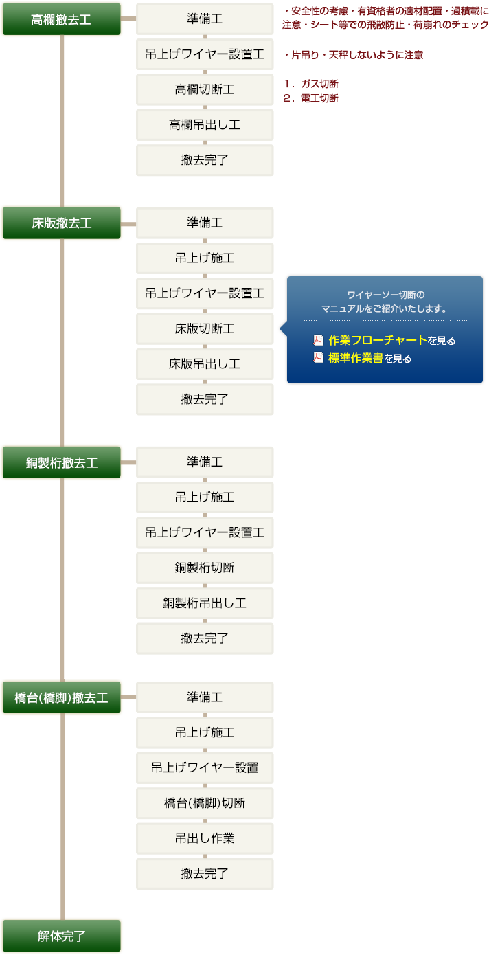 まず橋梁の構造を確認し、重量計算及び最適な解体工法を選定したプランニングを行います。コンクリート橋梁の解体は、床版・地覆を特殊切断機械(床版カッター・ウォールソー・ワイヤーソー)にて切断撤去をし、次に桁、最後に橋脚・橋台の切断撤去を行います。